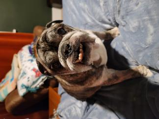 In August of 2025, Teddy fell ill to a rare disorder. Newly discovered by Colorado State University in conjunction with the Morris Animal Foundation, she was diagnosed with PBLEB, polyclonal b-cell lymphocytosis of english bulldogs. Teddy underwent treatment and started oral chemo, she passed in October succumbing to her advance age and failing health.